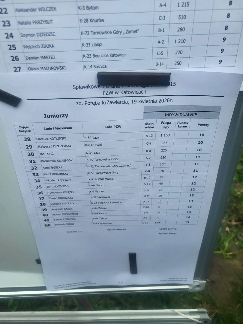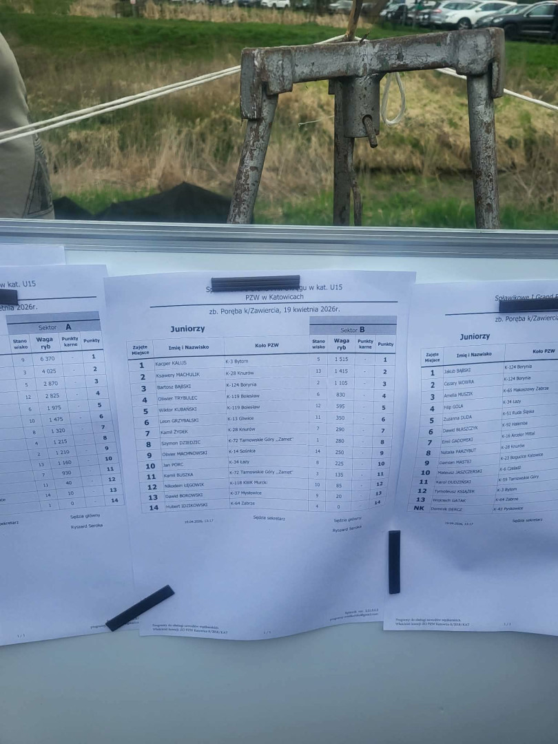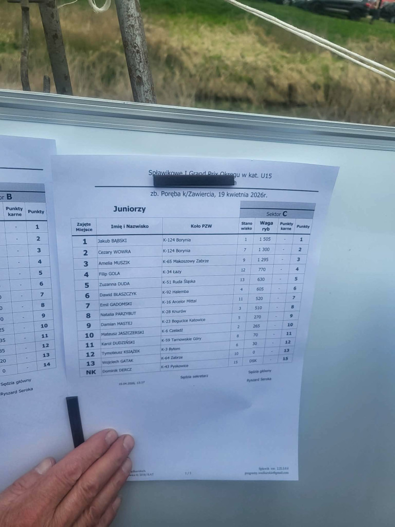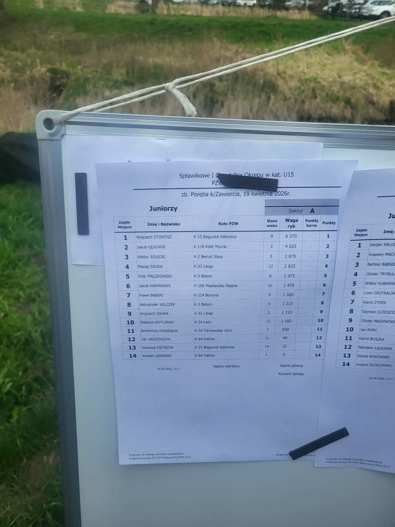 W dniu 19.04.2026r. 4 kadetów Koła PZW nr 124 Borynia brali udział w I zawodach z cyklu Grand Prix U15 na zbiorniku Poręba w Zawierciu. Cała czwórka zajęła bardzo wysokie miejsca: